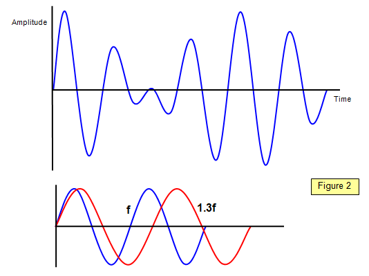adding two waves, one of frequency f and the other of frequency 1.3f.