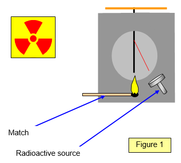 electroscope  with a polythene rod. Then hold a radium source near the leaf. The leaf will go down