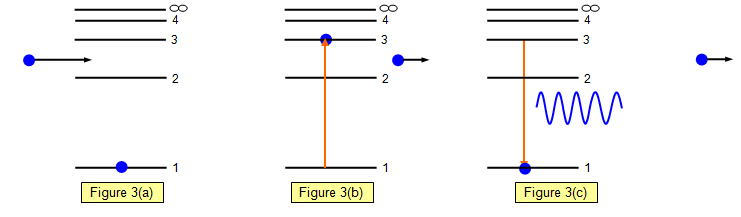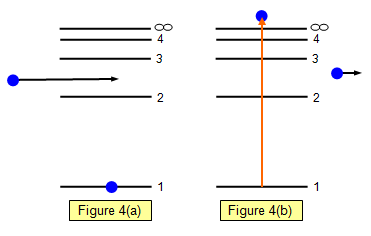 Figure 3 (b) the electron has been raised to level 3 and the colliding electron has lost some
