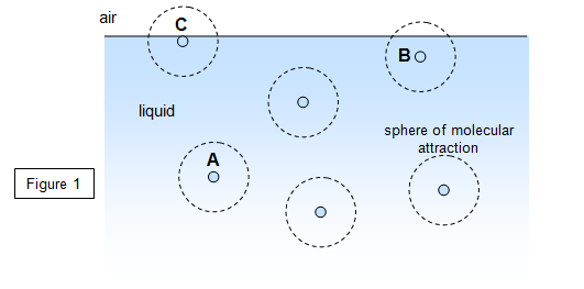 You can easily understand why the surface of a liquid behaves like a skin by looking at Figure 1. A molecule such as A within the body of the liquid will experience a force of attraction due to all other molecules within a small distance of A, this is called the sphere of molecular activity. Molecule A must be in equilibrium and so the resultant force on A is therefore zero. However, a molecule such as B very close to the surface will experience a net inward force; so too will a molecule such as C that is actually in the surface.