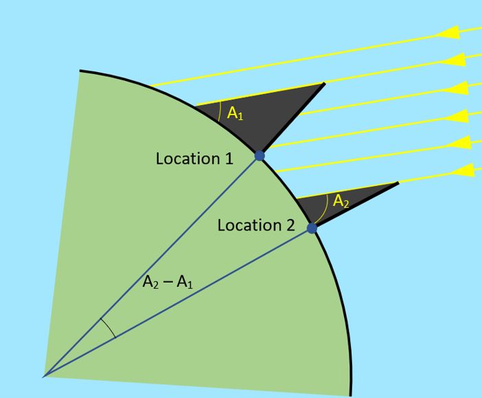5. Calculate the angle (A) that the sunlight makes with the horizontal at both locations
