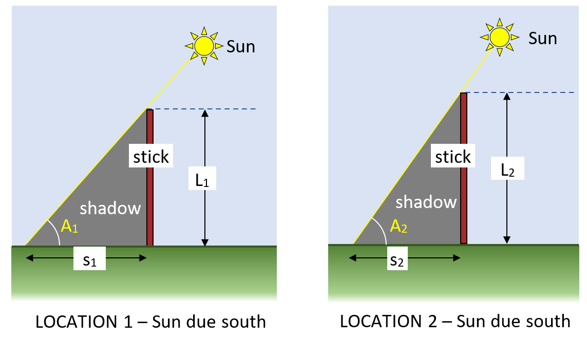 1. Put a stick vertically in the ground at two observing stations (schools) on approximately the same longitude. (The worked example shows schools in Plymouth (A2) and Inverness (A1))