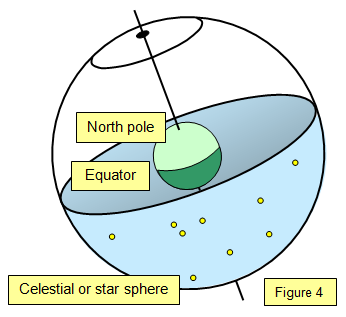 This diagram shows the Earth at the centre of the celestial sphere. The point where the projection of the polar axis of the Earth meets this sphere is called the celestial pole. A line drawn round the centre of the celestial sphere in the same plane as the equator of the Earth is called the celestial equator. As the Earth spins only the Pole Star seems to stay still, all the others appear to move round the Earth.