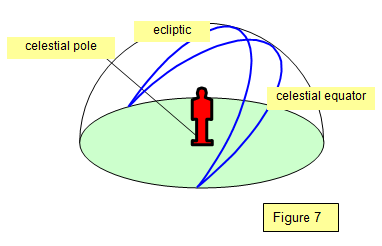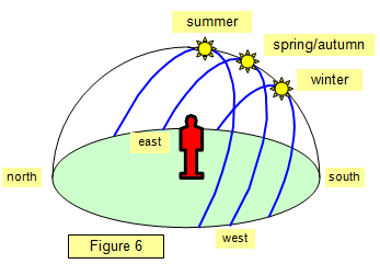 Because of the angle between the equator and the ecliptic the path of the Sun through the sky varies from one time of year to another. At the equinoxes it rises due east and sets due west but in summer and winter it follows a higher or lower path through the sky. (See figures 6 and 7)