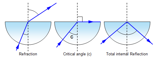 You can see this very easily if you float a weighted test tube in a beaker of water and then look down at the side of the test tube through the top of the water - you can't see into the tube and the side of it looks shiny. The same effect can be seen if you open your eyes under water and look up at the water surface from below. It is this effect that causes mirages and is used in the glass fibres of fibre optics.
