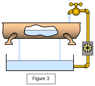 Think of a bath with TWO plug holes like the one shown in the diagram. The water from the plugholes flows into a tank and then a pump is used to pump it back up to the tap again. First imagine that ONE plug is taken out and the tap and pump are turned on to keep the water in the bath at the same level.