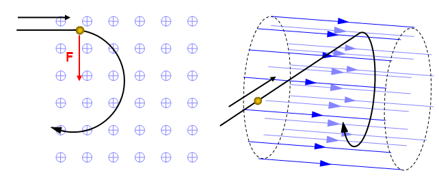 The two diagrams show a charged particle entering a magnetic field. (First in 2D and secondly in 3D). The force (F) acting between the field and the particle makes the particle move in a circular path with the force always acting towards the centre of the circle.