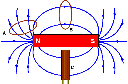 However the amount of magnetic flux flowing through a given area will change from one point to another around the magnet and you can understand this by thinking about a loop of wire placed in the field at two different points (A and B). You can see that in position B there are a smaller number of magnetic field lines passing through the loop than there is when it is in position A.