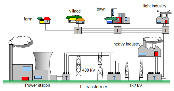 stations by generators at a potential of 25 kV. It is first stepped up to 400 kV by a transformer and then