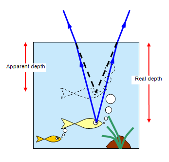 The refraction of light at the surface of water makes ponds and swimming pools appear shallower than they really are. A 1m deep pond would only appear to be 0.75 m deep when viewed from directly above.