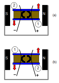 If we start with the coil in the position shown in diagram (a) then there will be an upward force on side (1) of the coil and a downward force on side (2) of the coil.