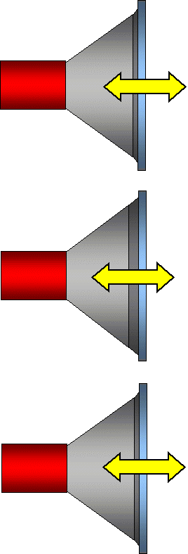 If the current changes, as it will from a sound source such as a microphone the cone is pulled backwards and forwards. The low notes will be of a lower frequency and so the cone will move backwards and forwards more slowly and so the movement is easier to see.
