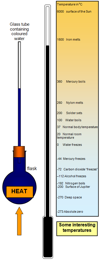 expansion of the liquid is "magnified" by allowing it to expand up a very narrow tube. A small