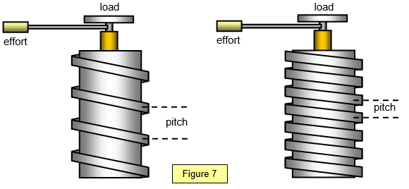 When the effort arm makes one complete turn the load is raised by a distance equal to the pitch of the screw.