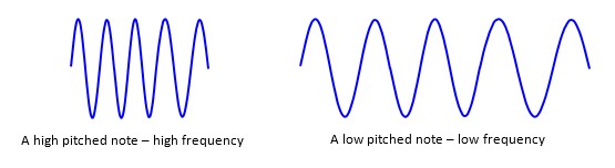 The pitch of a note is a general description that tells us whether the note is low or high. Low pitched notes have waves that are long while high pitched notes have waves that are short.