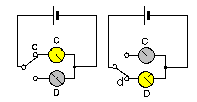 The next switch can change the path of the current. It has two contacts (c and d). It is called a TWO-WAY switch. When the switch is in position c, bulb C lights.