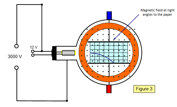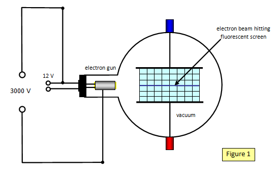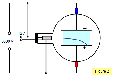 If a voltage is applied across the plates with the bottom plate positive, the electron beam will be attracted downwards towards the positive plate showing that the beam really is made up of negative particles. If the top plate is made positive the beam will be attracted upwards. (Figure 2)
