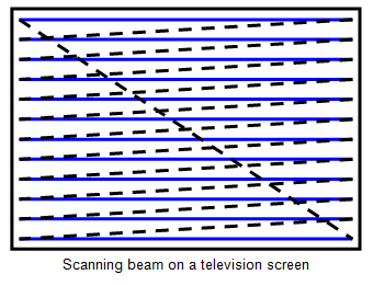 Unlike the CR0 the beam is moved by a set of electromagnetic coils at the base of the tube. The beam 'scans' the screen in a series of lines, starting at the top left and finishing at the bottom right. In modern televisions there are 625 lines, the odd ones are scanned first then the even ones. This stops the top left part of the picture fading out before the bottom right. The beam only takes 1/25 s to scan the whole screen once. You can see a simplified version of this in the diagram.