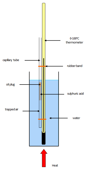 | SAFETY CONSIDERATIONS: The capillary tube contains a plug of sulphuric acid sealed in with oil. Do not open the lower end of the tube. Wear eye protection. Only heat the capillary tube when it is immersed in the water |