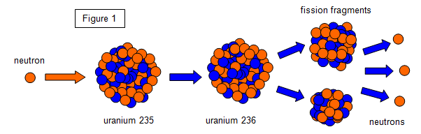 As you know the nucleus of an atom consists of protons and neutrons, held together by very large forces. In one type of uranium nucleus there are 92 protons and 143 neutrons - we call this uranium 235.
