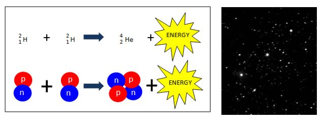 The reason that energy is produced is that the mass of the two deuterium nuclei is slightly greater than the mass of the one helium nucleus. This tiny difference becomes energy. You can work out the amount of energy released by using the famous equation proposed by Albert Einstein: