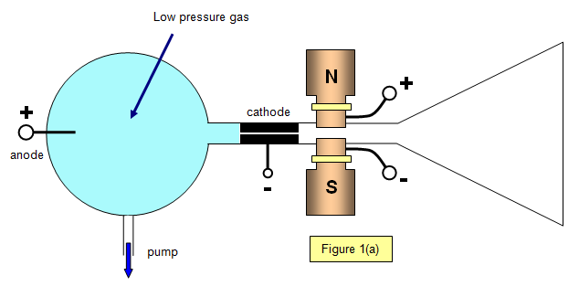 A discharge occurs in the low-pressure gas in the bulb at the left-hand end of the apparatus, producing positive rays that pass through the anode and into the right-hand end of the tube. Here they go through electric and magnetic fields that act in the Y-direction; the electric and magnetic forces on the particles are therefore at right angles to each other.