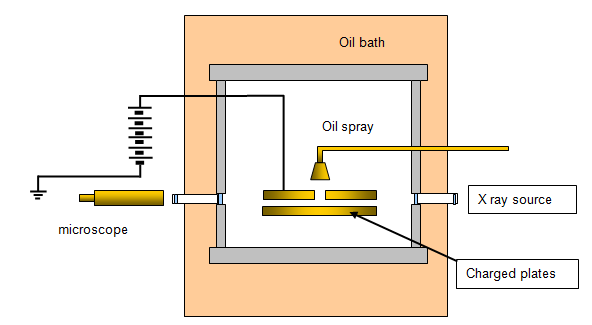 This experiment devised by Millikan in 1909 used electric fields to deduce the charge on an electron. Fine droplets of oil were sprayed through a hole in a horizontal plate and allowed to drift down through the air between it and a lower plate. As the drops left the spray they became negatively charged and when a potential difference was placed across the plates it was possible to adjust the size of this potential so as to just balance the gravitational pull on the drop.