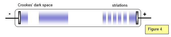 At 0.1 mm pressure the positive column becomes striated, the negative glow moves away from the cathode, Crookes' dark space appears and the cathode glow appears round the cathode (Figure 4). Most of the potential difference in the tube exists across the Crookes' dark space.