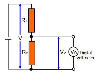 The proportion of the input voltage (V) dropped across R2 therefore falls and so the output voltage (Vo) is less than that measured with a digital meter.