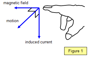 If the thumb and first two fingers of the right hand are held at right angles and the first finger is pointed in the direction of the magnetic field and the thumb in the direction of motion then the second finger gives the direction of the induced current (Figure 1).