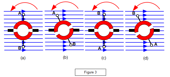 A current flows round the coil and one side is forced up by the magnetic field and the other is forced down Figure 3(b). The motion is made continuous by reversing the current direction through the coil by means of a split ring commutator and two brushes (Figure 3(c) and (d). The coil is kept rotating during the short time interval when there is no force acting on it by its own inertia.