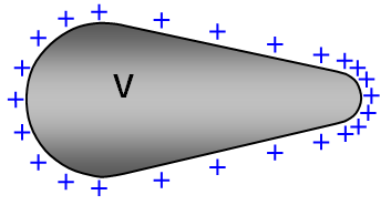 small r (a sharply curved surface) has a greater charge density than a surface with large R.