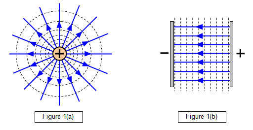 that round a point charge (known as a radial field because the field lines are extensions of the radius) and (b) that between a pair of parallel plates (known as a parallel field because the field lines are parallel to each other).