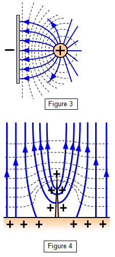 The final diagram (Figure 4) shows the field lines and equipotentials around a point on a flat surface. This is the situation produced around a lightning conductor. There is an intense field around the point shown by the closeness of the equipotentials there.