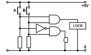 To open the lock the solenoid must be activated and this can be done by pressing both switches A and B. If B is pressed before A, however, the buzzer will sound.