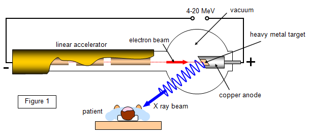 (a) accelerating electrons to high energies where they collide with a heavy metal target to produce high energy X rays (photo and Figure 1)