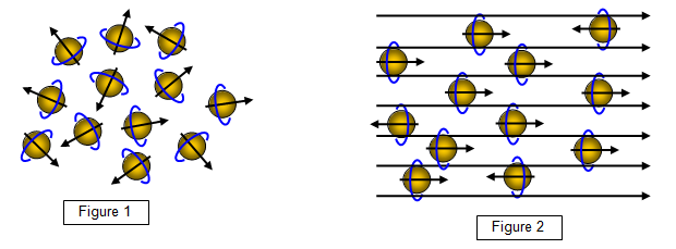 If these spinning nuclei are subjected to an external magnetic field they will align themselves with the field, just like iron filings do on a larger scale. Most will be parallel to the field (low energy state) but a few will be anti-parallel (high energy state).