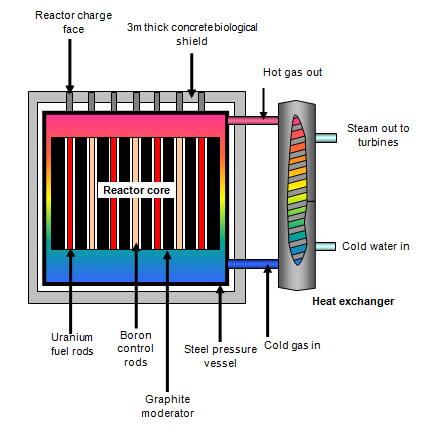 There are two reactors, each reactor core contains 355x103 kg of uranium fuel (99.3% U238, 0.7% U235) in 36 000 fuel rods, each one a metre long, packed in magnesium alloy (magnox) cans, placed eight high in 4500 channels in the 1891 tonnes of graphite moderator. The magnesium alloy is used because it has a low neutron absorption. The core (14m high and 8 m diameter) is contained in a 20m diameter, 7.62 cm thick steel pressure vessel and heat is drawn off by carbon dioxide gas at 1.28x106 Pa(185 p.s.i) which is blown through the core. The temperature of this gas rises from 180oC to 360o as it passes through the core. This is used to turn water into steam in heat exchangers and the steam drives turbines giving an output of 215 MW of electrical power to the national grid.