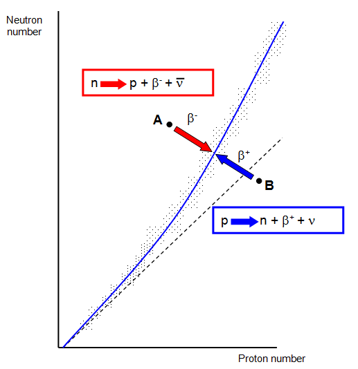 The graph shows the variation of neutron number with proton number. For light atoms (such as helium) these two numbers are equal – there are as many neutrons in the nucleus as there are protons. However for more massive elements the neutron number is much greater than the proton number. For example a U235 nucleus contains 92 protons but 143 neutrons. Particles below the line (such as B) will decay by beta plus (positron) emission while those above (such as A) will decay by beta minus emission.