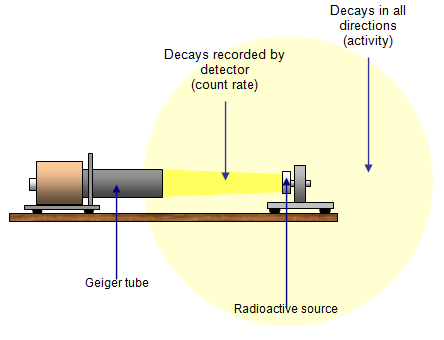The activity is the total number of emission per second in all directions from the source taken. However if you use a Geiger tube (or any other detector) to measure the number of emissions you will only record a fraction of the total emissions. This is because normal detectors do not usually surround the source and so you only detect particles (or photons) emitted into a small angle (see diagram). This means that the observed count rate is always much less than the activity of the source.