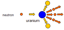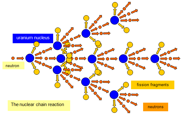 However once one nucleus has fissioned neutrons are released and these can go on to split further nuclei. If this fission can be sustained a chain reaction is produced. A diagram of such a reaction is shown in the diagram above. This reaction will proceed at high speed, the time for an emitted neutron to collide with another nucleus to produce a second fission is about 0.01 microsecond.
