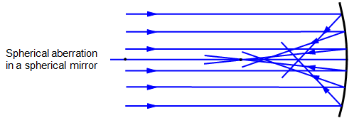 The problem with spherical mirrors is that rays at different distances from the principal axis of the mirror are not all brought to a focus at the same distance from the main mirror. The ones furthest from the centre being focussed closer to the mirror than those at the centre. This defect is called spherical aberration. (See following diagram). It is for this reason that parabolic mirrors are used where all the rays are brought to a focus at one point.