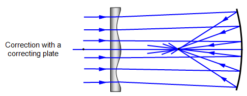However there is another solution to the difficulty, this is known as a Schmidt telescope. In a Schmidt telescope the problem is solved by using an ordinary spherical mirror but putting a correcting plate at the front end of the telescope tube. This correcting plate is like a large lens but with a complex design – it is convex in the centre and concave towards the edges. This changes the direction of the incoming rays and means that the rays far from the axis do not converge so quickly and so all rays are brought to a focus at one point.