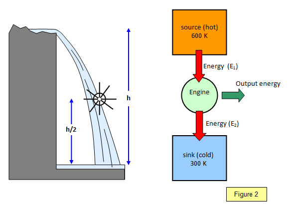 the heat engine with a waterwheel. If the waterwheel is placed half way up the waterfall then