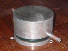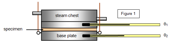The specimen rests on a brass base plate and a steam chest is placed on top. Steam is passed through the chest and the temperature of the base plate and the base of the steam chest is measured.