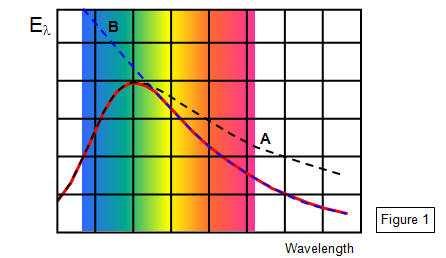 When scientists were attempting to deduce equations that would fit the black body radiation curves they encountered considerable difficulty - none of the equations that they produced using classical Physics would fit the experimental results (shown as the red line). The curves either fitted well for the ultra violet (line A) but were unsatisfactory at longer wavelengths or they were fine for infrared but suggested far too much energy in the short wavelength region – the so- called ultra violet catastrophe (line B). (See Figure 1)