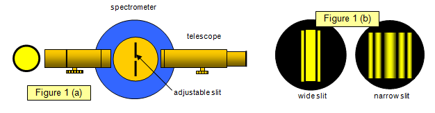 The Fraunhofer diffraction due to a single slit is very easy to observe. An adjustable slit is placed on the table of a spectroscope and a monochromatic light source is viewed through it using the spectroscope telescope (see Figure 1(a)). An image of the slit is seen as shown in Figure 1(b). As the slit is narrowed a broad diffraction pattern spreads out either side of the slit, only disappearing when the width of the slit is equal to or less than one wavelength of the light used.