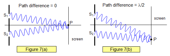 In Figures 6 and 7 you can see that at the different points on the screen the waves from S1 have travelled a different distance from those from S2. In Figure 6 the path difference is zero, in Figure 7 it is half a wavelength.