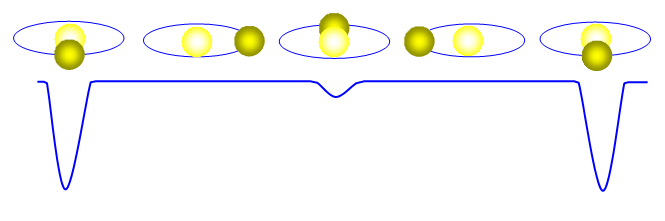 As they move one of the stars is eclipsed by the other and this affects the total observed brightness of the pair. The larger dip in the light curve is when the dimmer star moves in front of the brighter one. The smaller dip is where the brighter star moves in front of the dimmer one.