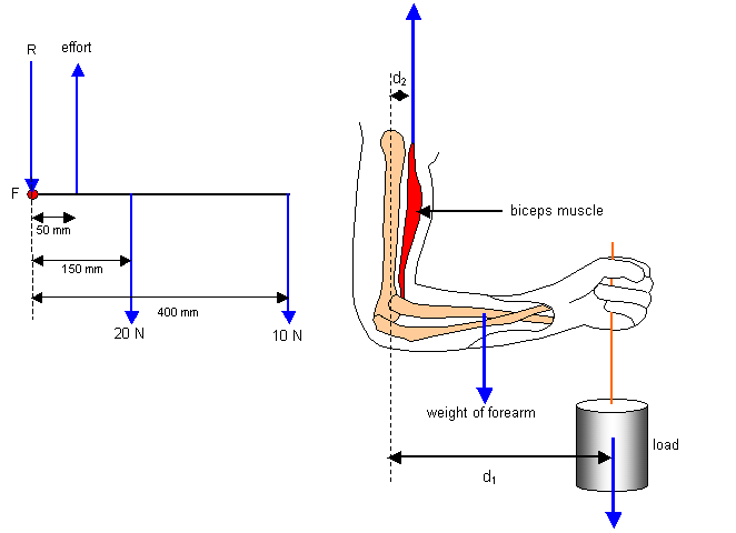 The pivot (or fulcrum) is at the elbow joint, the load is held in the hand and the effort is applied in the biceps muscle. In the arrangement shown the forearm is horizontal and the force in the biceps muscle acts vertically. (N.B – the blue force lines represent the direction of the forces and NOT their relative magnitude)